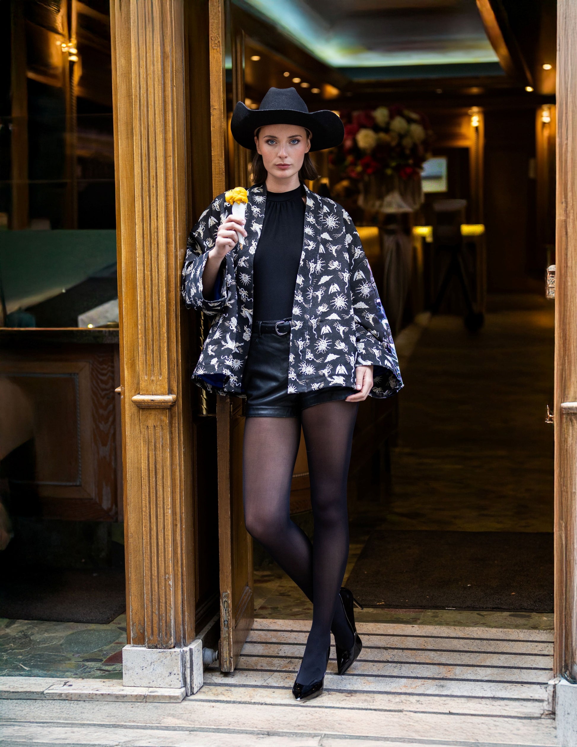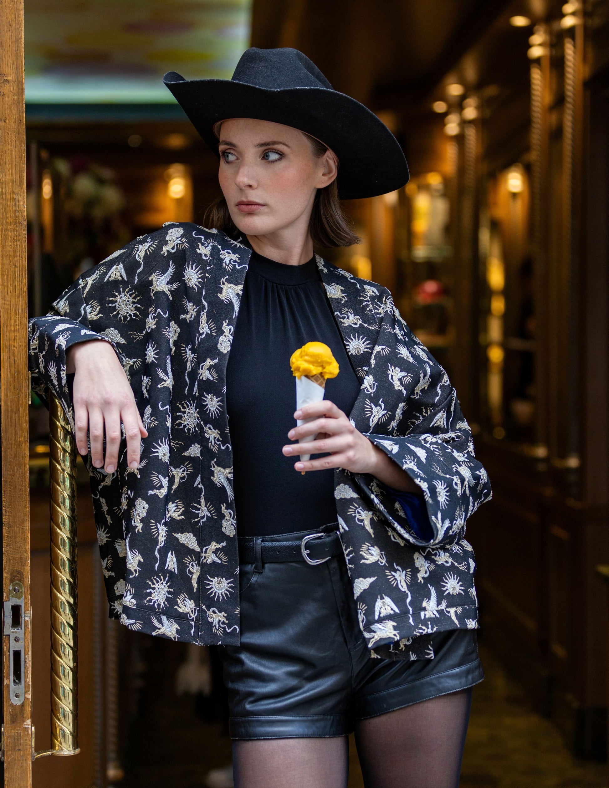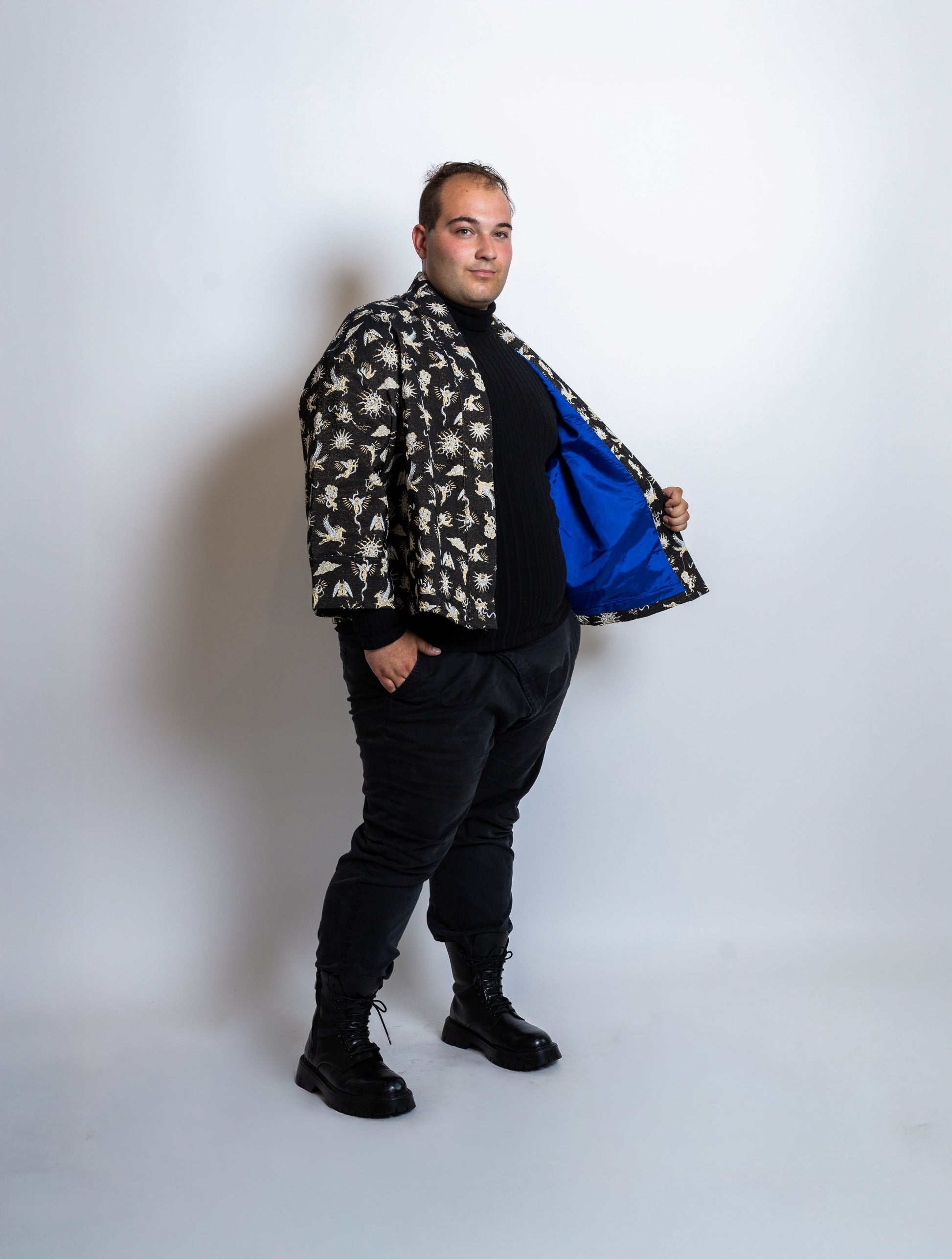 Le Kimono Aengus incarne la rencontre parfaite entre tradition et modernité. Conçu à la main avec un tissu d’exception, il se distingue par sa coupe courte, fluide et ses motifs raffinés.